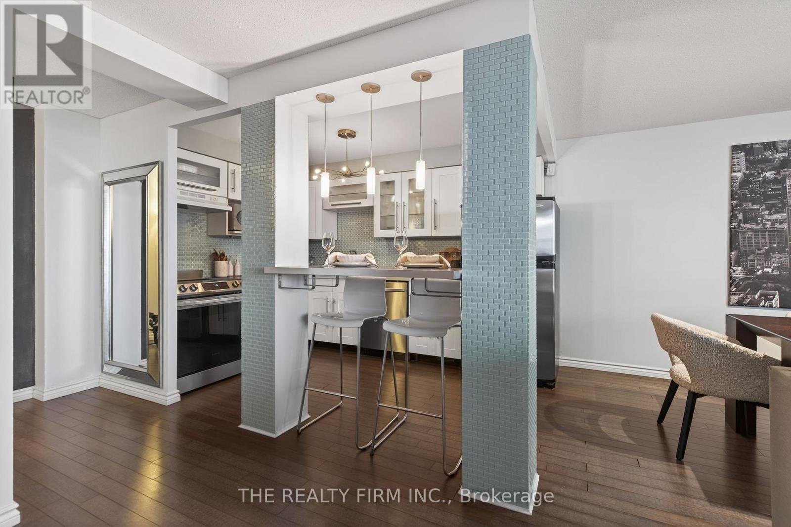 Experience elevated urban living at 2404-323 Colborne Street, ideally positioned in the heart of downtown London. This move-in ready condo offers modern updates, functional design, and sweeping city views -- all within steps of the restaurants, cafés, entertainment, and everyday conveniences that make downtown living so desirable. The open-concept kitchen, living, and dining area is designed for easy everyday living and entertaining. The updated kitchen features crisp white cabinetry, stainless steel appliances, a stylish tile backsplash, and breakfast bar with seating that connects seamlessly to the main living space. Laminate flooring runs throughout, creating a clean and cohesive feel. The inviting living room offers sleek cabinetry along the media wall and sliding doors that lead to a northeast-facing balcony with city views, perfectly positioned beside the dining area for effortless hosting or quiet mornings above the city. Two well-proportioned bedrooms provide comfortable accommodation, including a primary bedroom with mirrored closet and private 3-piece ensuite. A modern 4-piece bathroom features a glass vessel sink vanity and tiled tub/shower combination. The suite also includes in-suite laundry with shelving for added everyday convenience. Residents enjoy underground parking, visitor parking, and an impressive selection of building amenities including an indoor pool, hot tub, sauna, gym, tennis court, party room, and community BBQ area. Located just moments from RBC Place, Canada Life Place, shopping, transit routes, dining, and entertainment, this is an exceptional opportunity to enjoy the convenience and energy of downtown London in a well-appointed, move-in ready condo. (id:4069)