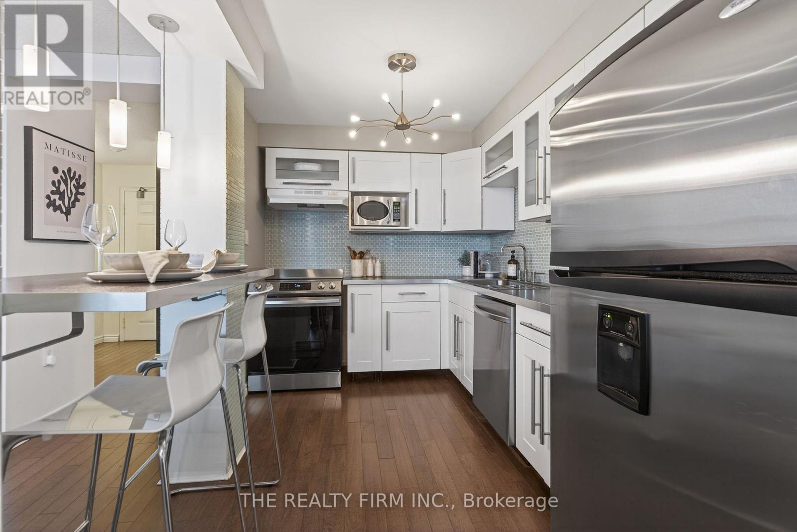Experience elevated urban living at 2404-323 Colborne Street, ideally positioned in the heart of downtown London. This move-in ready condo offers modern updates, functional design, and sweeping city views -- all within steps of the restaurants, cafés, entertainment, and everyday conveniences that make downtown living so desirable. The open-concept kitchen, living, and dining area is designed for easy everyday living and entertaining. The updated kitchen features crisp white cabinetry, stainless steel appliances, a stylish tile backsplash, and breakfast bar with seating that connects seamlessly to the main living space. Laminate flooring runs throughout, creating a clean and cohesive feel. The inviting living room offers sleek cabinetry along the media wall and sliding doors that lead to a northeast-facing balcony with city views, perfectly positioned beside the dining area for effortless hosting or quiet mornings above the city. Two well-proportioned bedrooms provide comfortable accommodation, including a primary bedroom with mirrored closet and private 3-piece ensuite. A modern 4-piece bathroom features a glass vessel sink vanity and tiled tub/shower combination. The suite also includes in-suite laundry with shelving for added everyday convenience. Residents enjoy underground parking, visitor parking, and an impressive selection of building amenities including an indoor pool, hot tub, sauna, gym, tennis court, party room, and community BBQ area. Located just moments from RBC Place, Canada Life Place, shopping, transit routes, dining, and entertainment, this is an exceptional opportunity to enjoy the convenience and energy of downtown London in a well-appointed, move-in ready condo. (id:4069)