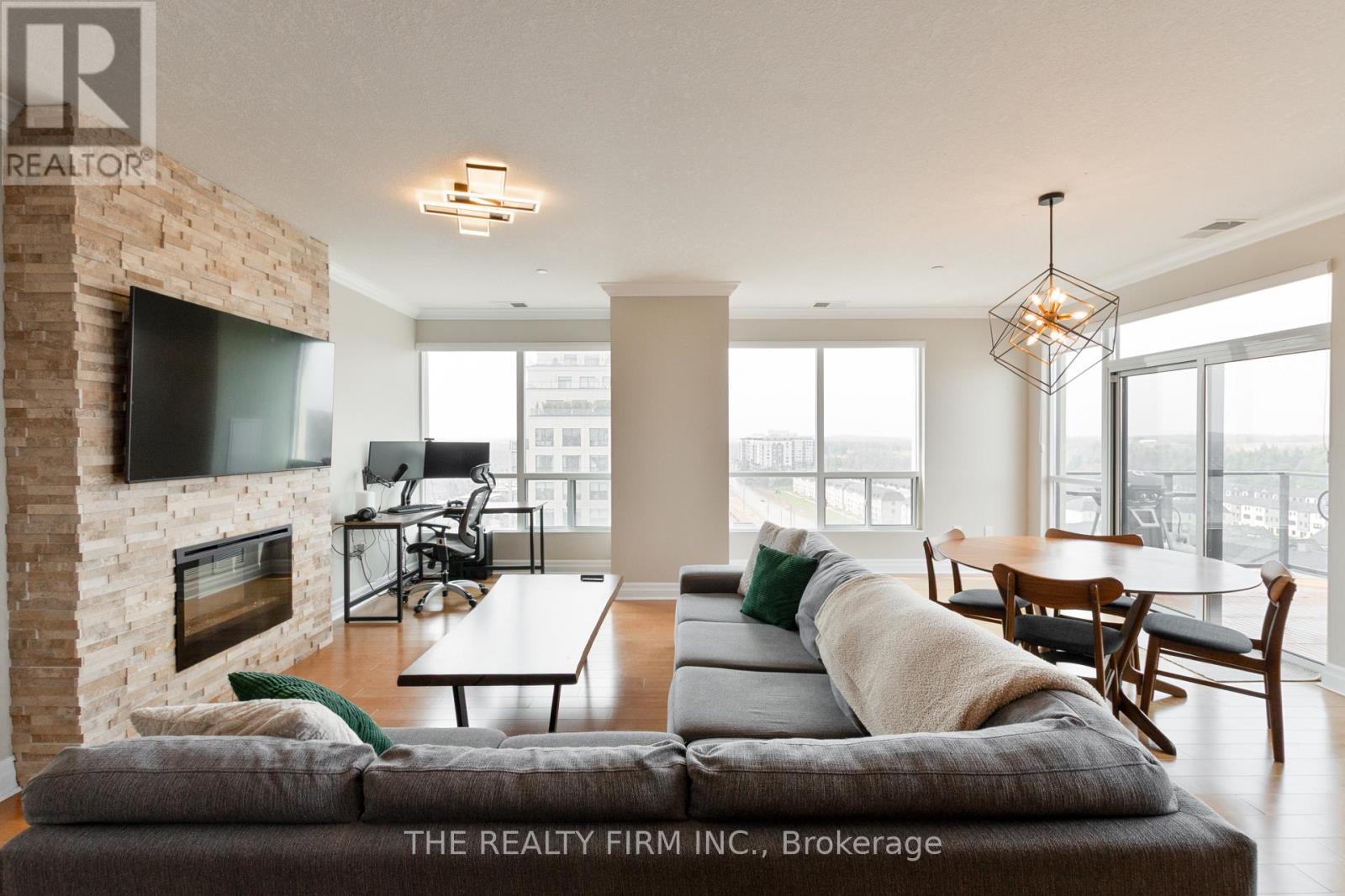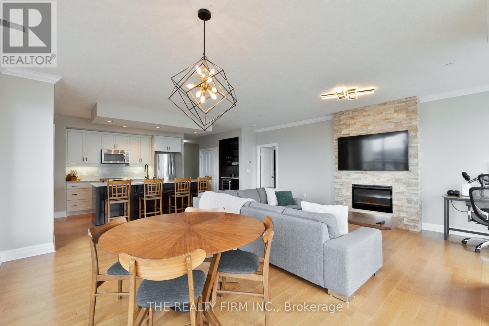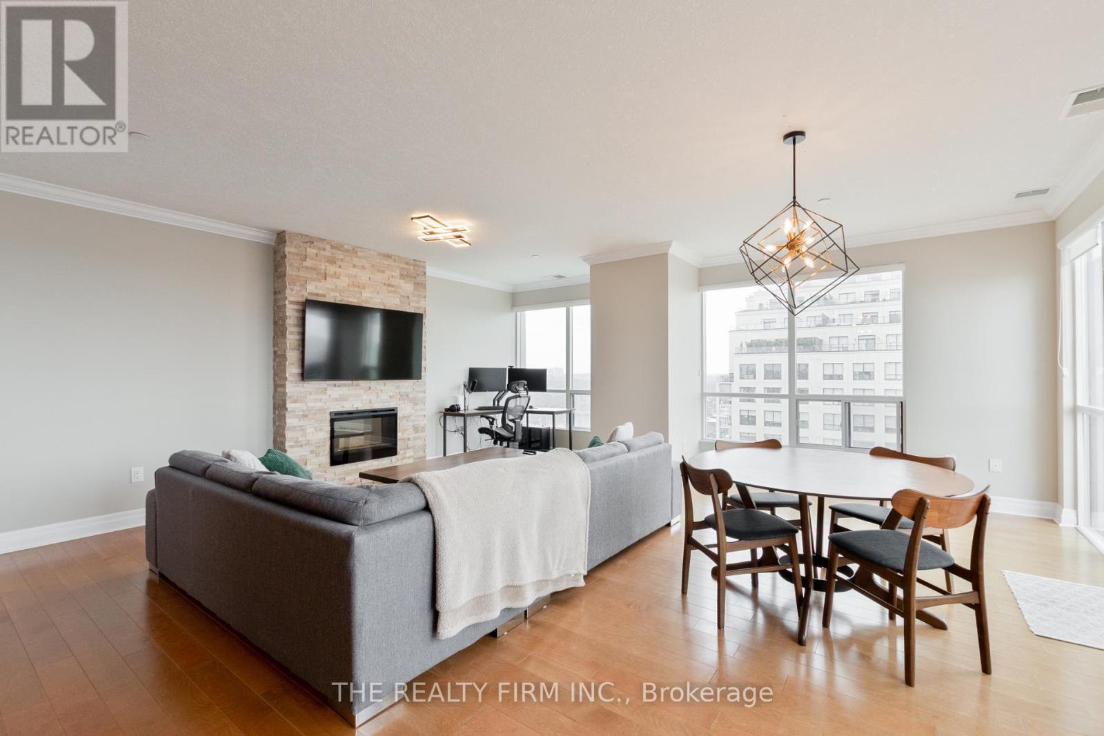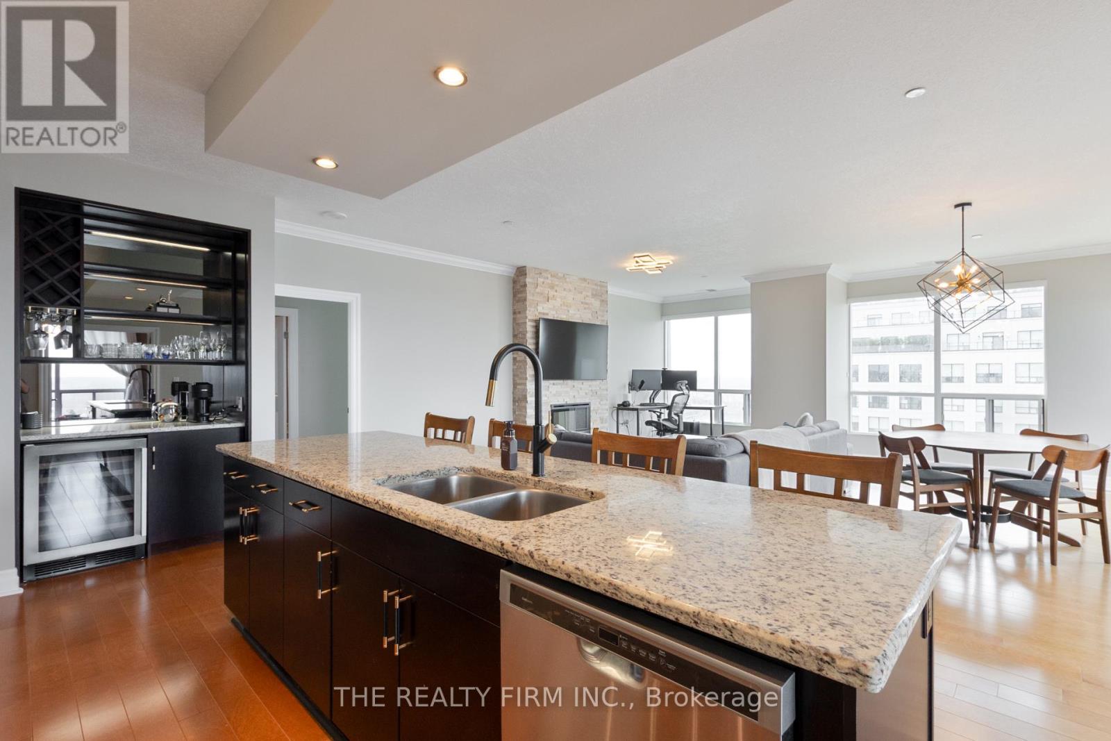 Elevate your lifestyle in this stunning 10th-floor condo, offering sophisticated design and breathtaking panoramic views to the north and west. This beautifully designed 3 bedroom, 2 bathroom condo offers the perfect blend of low-maintenance living and modern luxury. With high ceilings and an open-concept layout, the space is filled with natural light, creating a bright and inviting atmosphere. The upgraded kitchen is a chef's dream, featuring granite countertops, stainless steel appliances, spacious island, and custom built-in bar with beverage fridge--perfect for entertaining. The bright living and dining area showcases a striking stone fireplace, complemented by sliding patio doors leading to your north-facing balcony. The primary suite is a private oasis with a custom walk-in closet and a spa-inspired ensuite, complete with a glass-enclosed tiled shower and separate air-bubble soaker tub, while two additional bright and spacious bedrooms are complemented by a well-appointed 4-piece main bathroom with a glass-enclosed tub and shower. A spacious second bedroom and a versatile den--perfect for a home office or 3rd bedroom. Enjoy the convenience of an in-suite laundry room with storage, tiled foyer and two underground parking spaces plus an indoor storage locker. Enjoy a truly elevated lifestyle with access to premium amenities, including a golf simulator, fitness centre, indoor pool, and private theatre room--offering the perfect balance of relaxation and recreation. Ideally located just minutes from Masonville Mall, with high-end shopping, dining, and everyday conveniences all within reach. Luxury living in a location that delivers. (id:4069)
