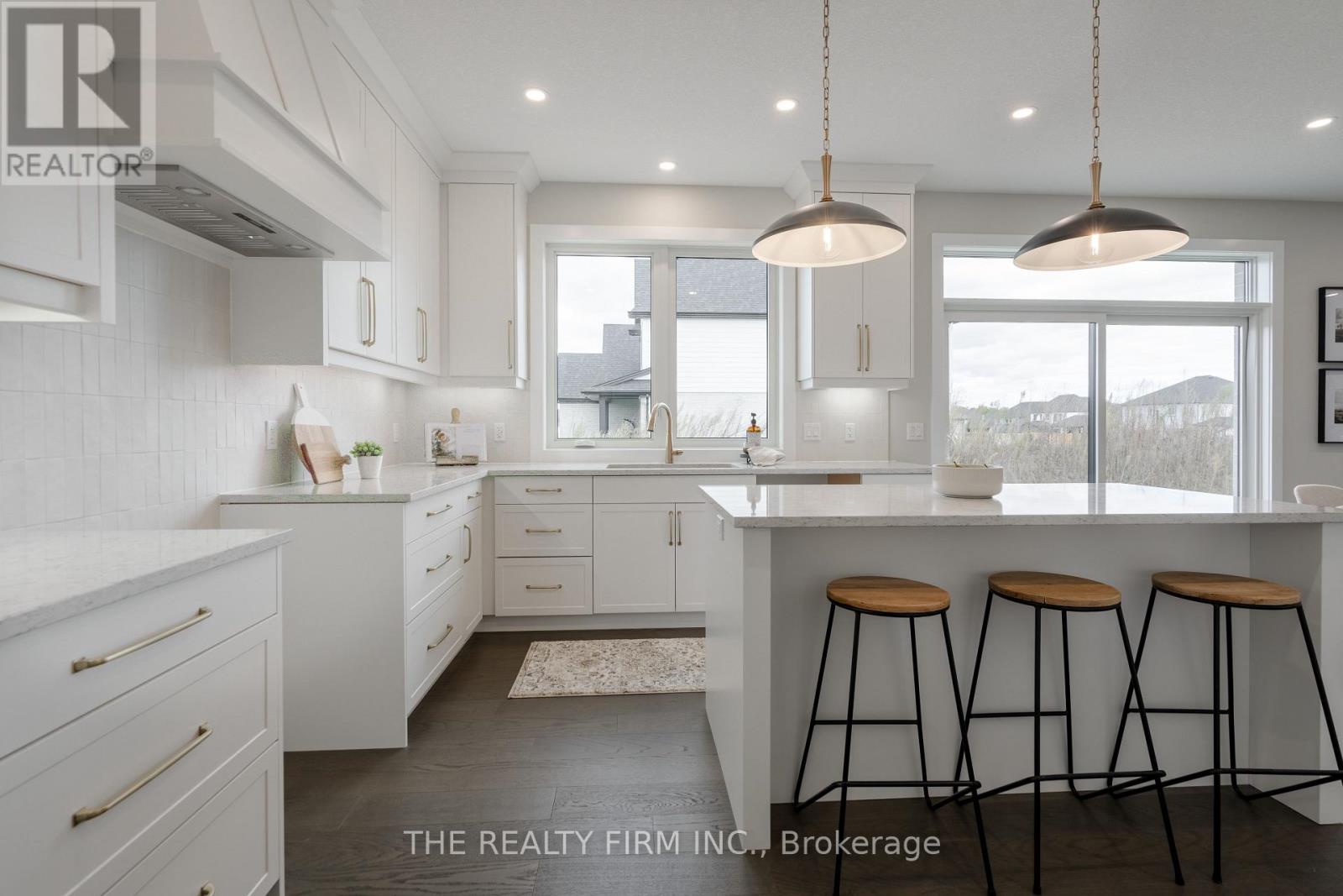 Welcome to The Hampshire, set within Dorchester's upscale, family-friendly Boardwalk at Mill Pond neighbourhood. Proudly presented by Stonehaven Homes, this stunning two-story model home is conveniently located just a short drive from Highway 401, outside the city of London. This home is designed to impress from the onset with its timeless brick and Hardie board facade, double-car garage, and covered front porch. With 3 bed / 3 bath, this home offers ample space for comfortable living. Step inside and be greeted by an abundance of natural light, soaring ceilings, and a den, which can easily function as a formal dining room or office. The main floor showcases beautiful ceramic tile and hardwood floors, large windows, and an oversized sliding door that floods the space with natural light. The living room is enhanced by a modern gas fireplace. The kitchen is a true masterpiece, featuring ample cabinetry, a double-basin stainless steel kitchen sink, and a large kitchen island. The main level also includes a practical mudroom/laundry room with additional storage to help keep your home organized and tidy, and a 2-piece bathroom. The upper level has a large master bedroom with a 4-piece bathroom that features a glass tile shower, double sinks, and a vanity. Two other well-appointed bedrooms, a large walk-in closet for extra storage, and another 4-piece bathroom complete the space. The unfinished basement offers a blank canvas to tailor to your needs. Whether you envision a 4th bedroom and large living room, an oversized rec room, an adult playground, or more, the possibilities are endless. Experience the pride of Stonehaven Homes and the beauty of The Boardwalk at Mill Pond in Dorchester. Discover a harmonious blend of modern living, exceptional craftsmanship, and the tranquility of nature in this remarkable model home. Please note: Photos are from a previously built, upgraded model and are for illustrative purposes only. (id:4069)
